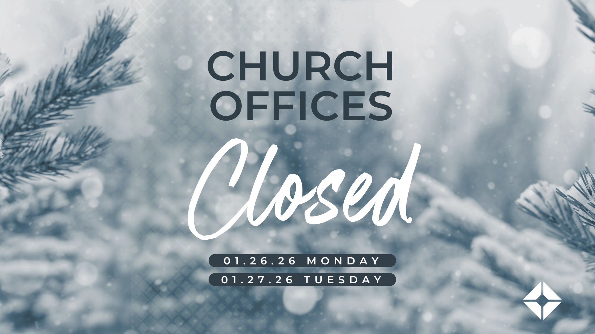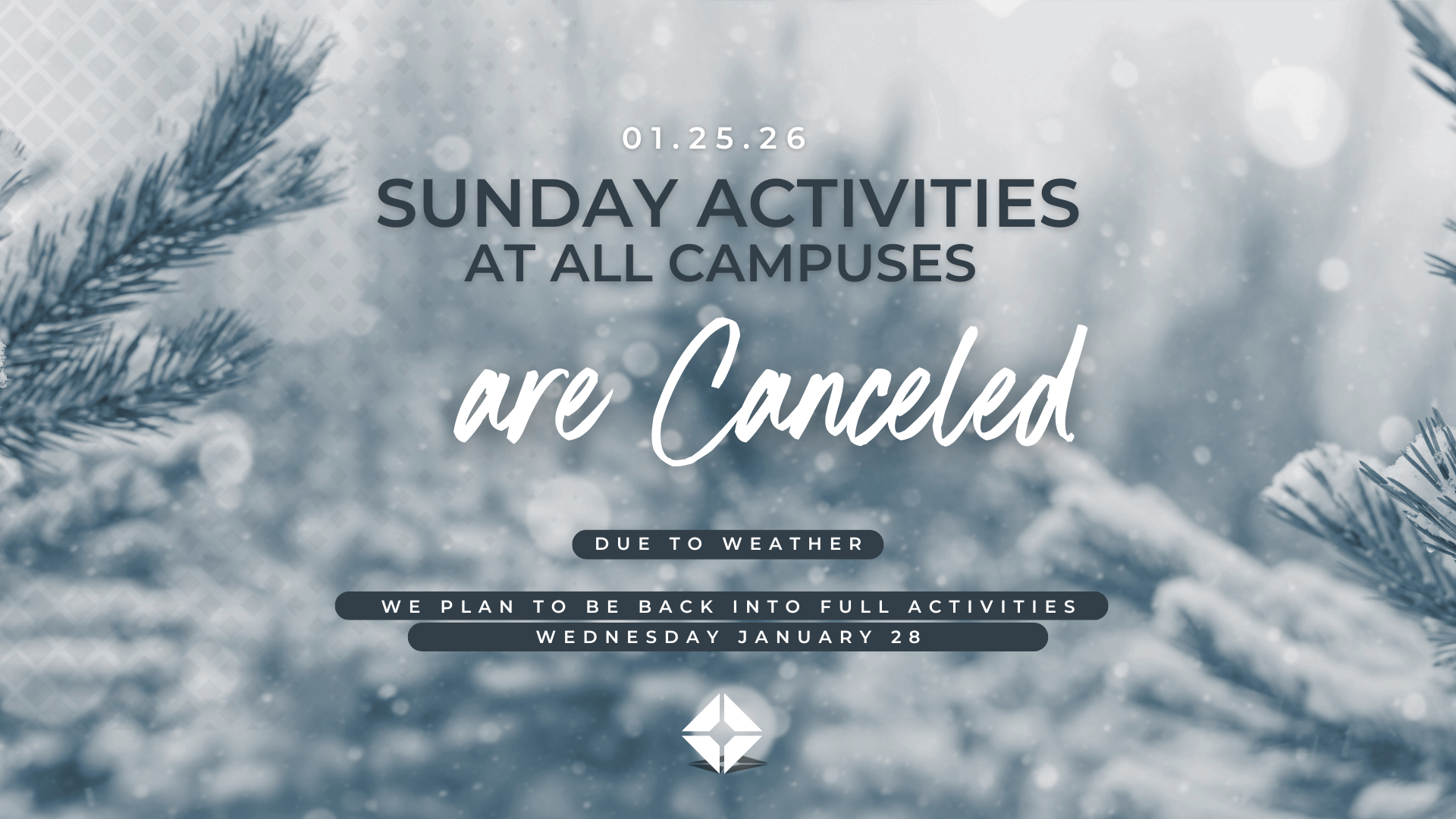 Out of an abundance of caution, and with the safety of our church family in mind, all weekend activities at all campuses have been canceled due to the likelihood of ice accumulation overnight and into Sunday. We plan (weather permitting) to be back with full church activities Wednesday January 28th!