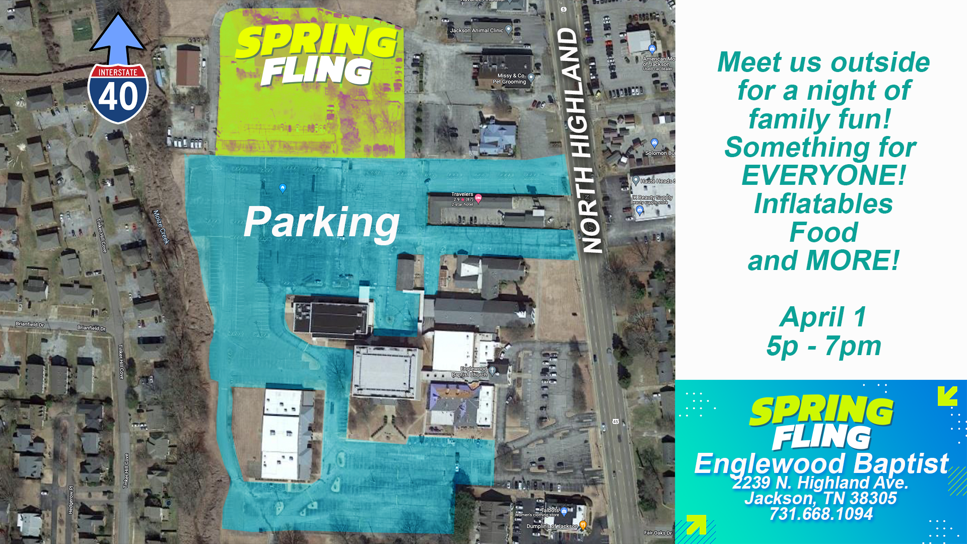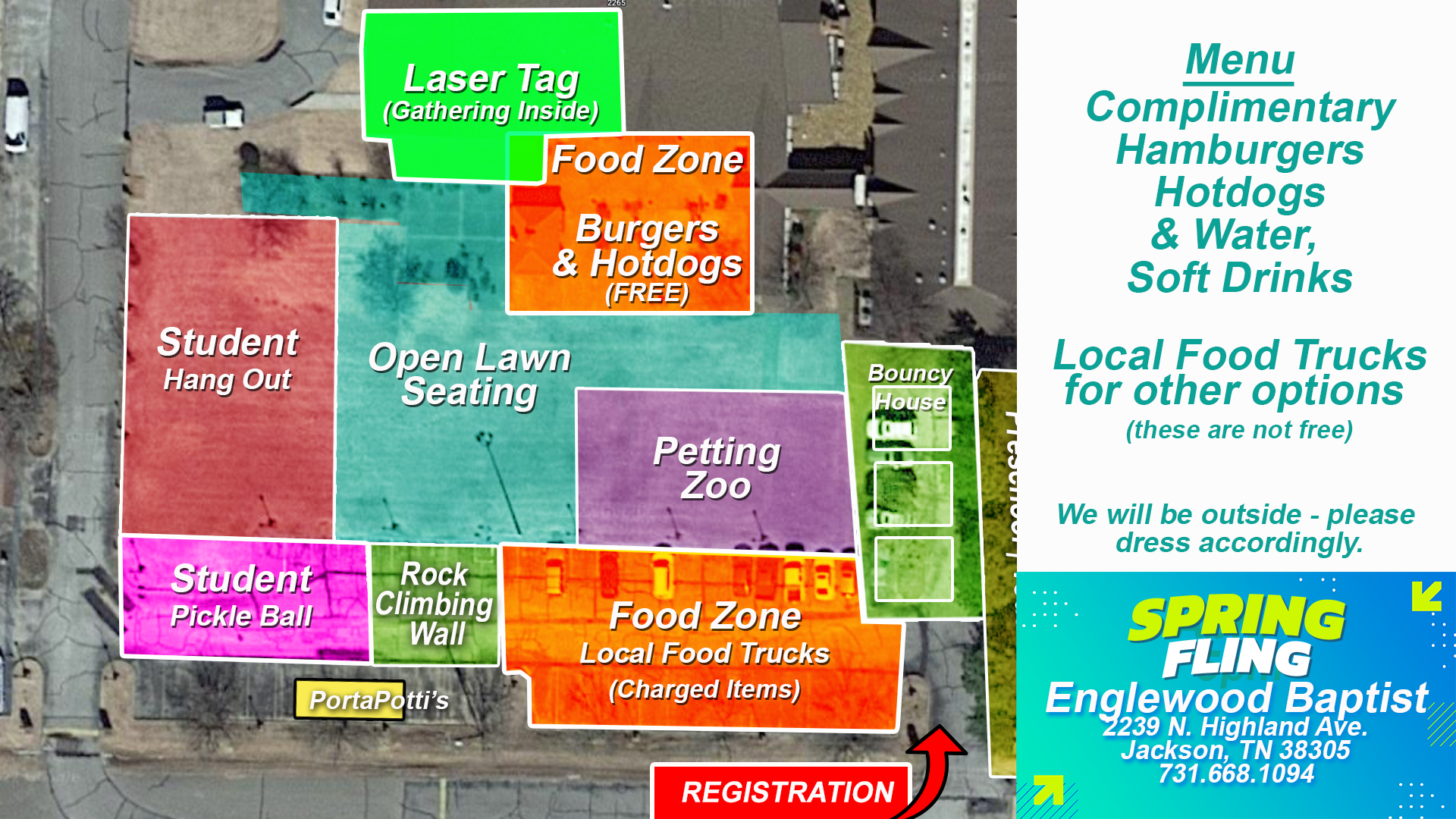 At the Highland Campus, enjoy inflatables, a petting zoo, a fenced kids’ playground with Children’s Egg Hunts, and Laser Tag for older kids. There’s also a large Food Zone and a student hangout area featuring an outdoor Pickleball court. Bring your lawn chairs, relax, and spend time with friends and family!